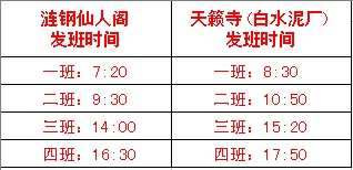 7月5日:開(kāi)通漣鋼仙人閣至天籟寺、白水泥廠的專線班車,每天四班,運(yùn)行線路及發(fā)班時(shí)間如下:
